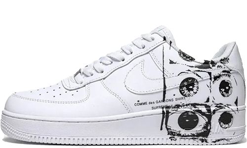 Nike Air Force 1 Low x Supreme x Comme des Garçons — коллаборация 2018 года, сочетающая классический силуэт с авангардными деталями. Кроссовки выполнены из чёрной кожи с белым Swoosh, разделённым по центру, и украшены совместным брендингом на пятке и язычке. Модель сочетает в себе минимализм и провокационный дизайн.