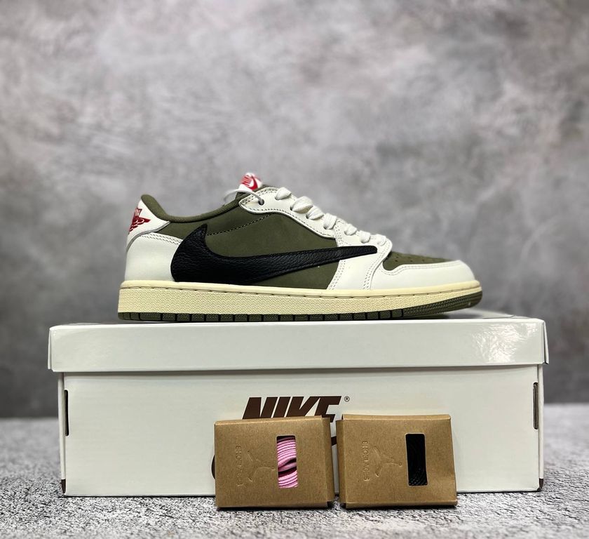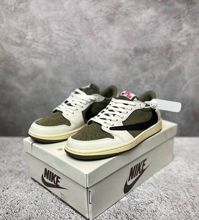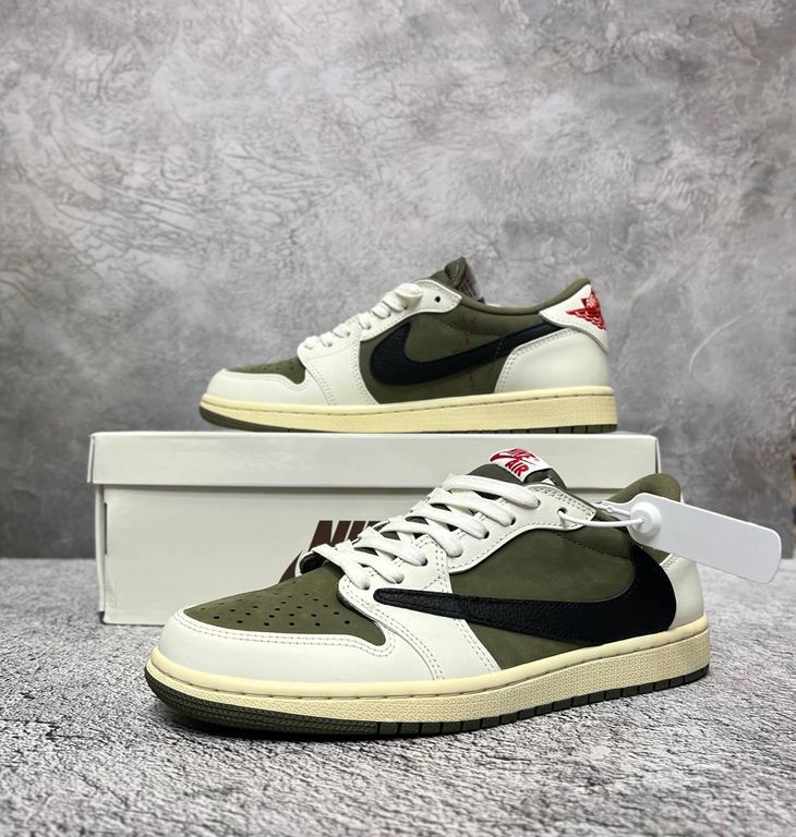 Коллаборация с Трэвисом Скоттом в оливковых тонах с реверсивным камуфляжным верхом. Уникальные детали включают приспущенное заднее крыло и дополнительные шнурки для индивидуальной шнуровки.
