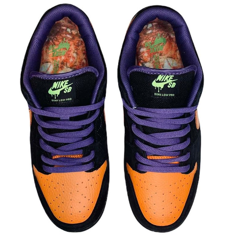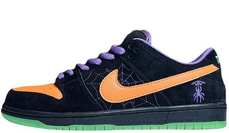 Nike SB Dunk Low Night of Mischief - жуткая интерпретация данков в духе Хэллоуина. Тёмный верх украшен тыквенными акцентами и светящимися в темноте элементами, а проверенная платформа SB сохраняет комфорт при катании и создаёт мистическое настроение.